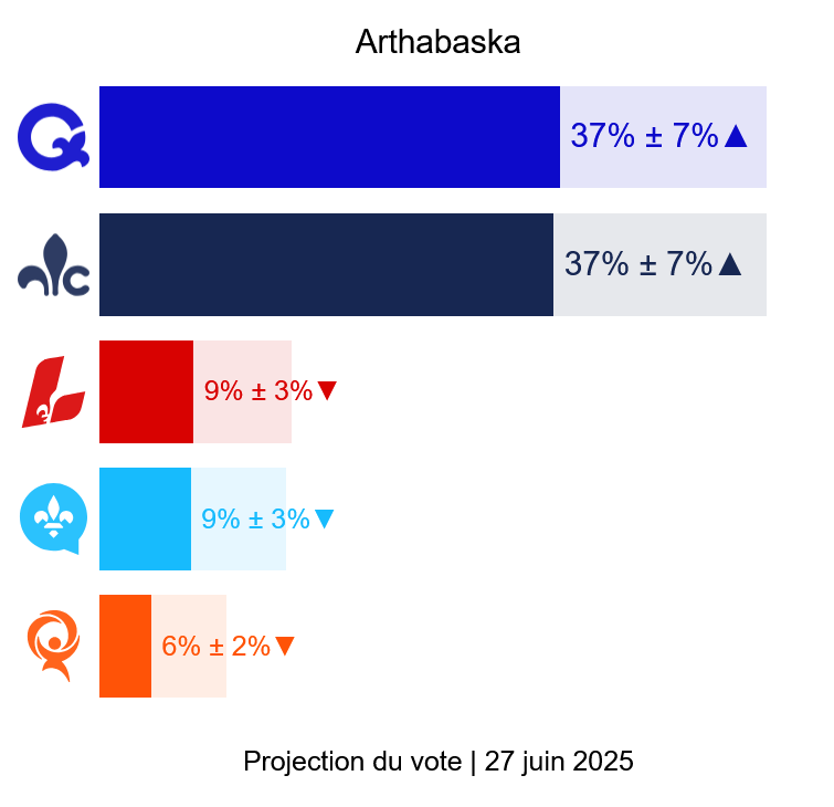 La plus récente projection Qc125 dans Arthabaska (27 juin 2025) commençait certes à dater (aucune donnée publique n’ayant été publiée depuis), mais elle plaçait PQ et PCQ au coude-à-coude, avec un léger avantage pour le PQ dans les probabilités de victoire.