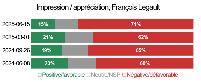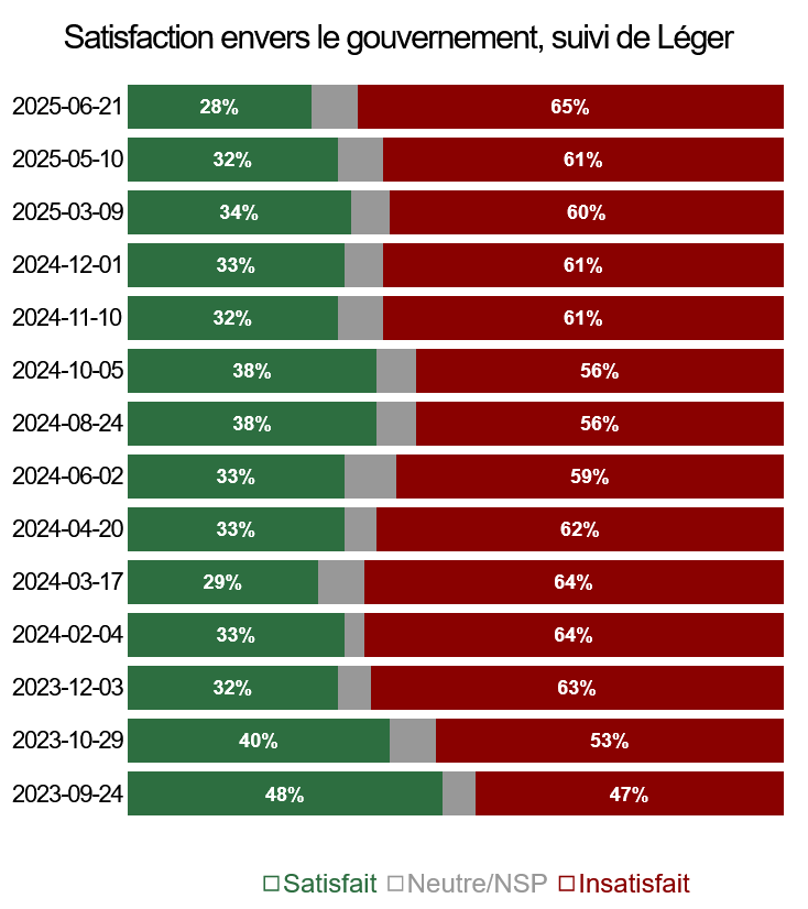 La question se pose, car ce résultat ne tombe pas du ciel. La satisfaction envers le gouvernement a fortement reculé depuis 2023 (voir graphique ci-dessous, données Léger).