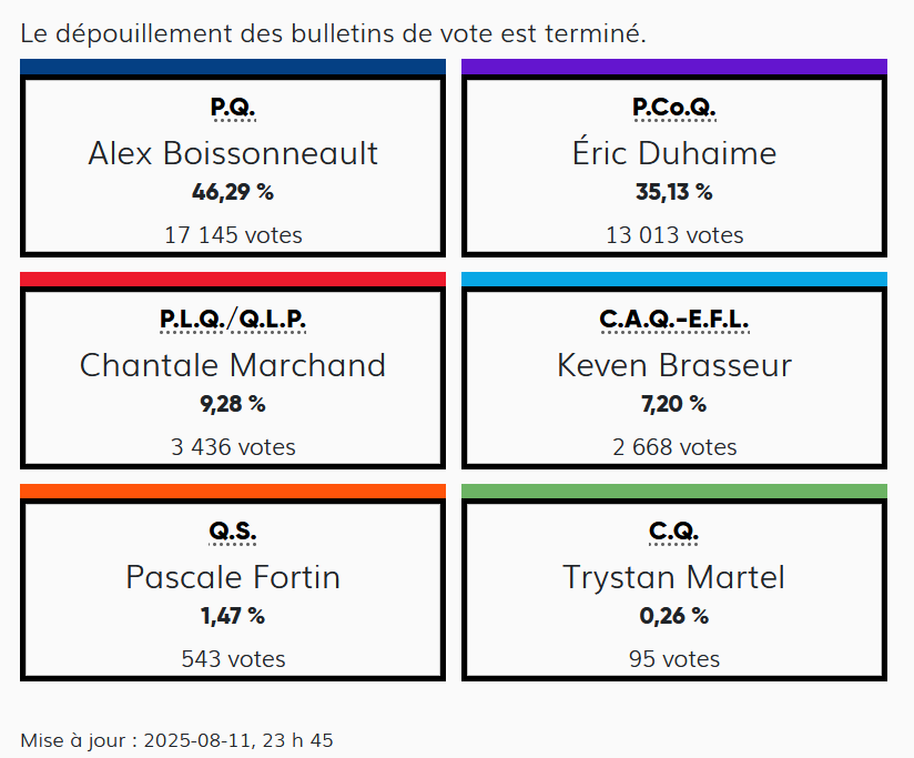 La formation souverainiste ajoute ainsi un sixième député à son caucus, grâce à une troisième victoire consécutive en élection partielle depuis 2023 (Jean-Talon, Terrebonne, Arthabaska).