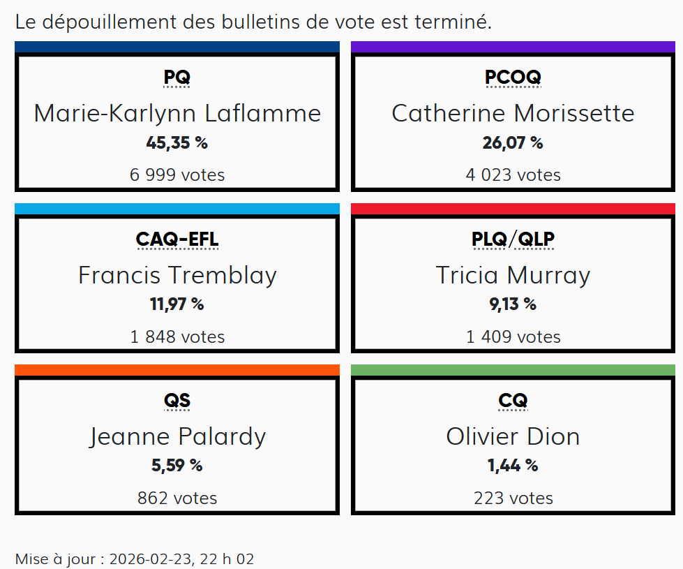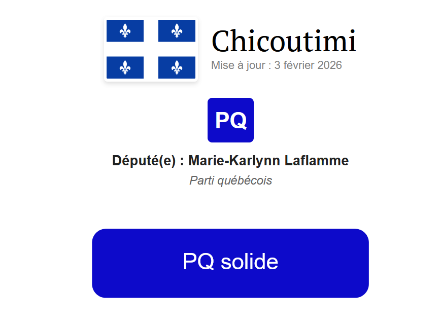 Après une pause de huit ans, Chicoutimi retourne au PQ. La péquiste Marie Karlynn Laflamme a facilement remporté l'élection partielle, alors que le PCQ arrive deuxième et la CAQ s'effondre — encore.