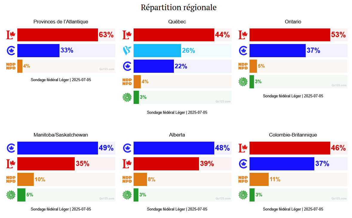 Le plus récent sondage fédéral de Léger, réalisé pour le National Post, a été publié vendredi dernier. Il montre lui aussi des chiffres dominants pour les libéraux de Carney sur toute la ligne.