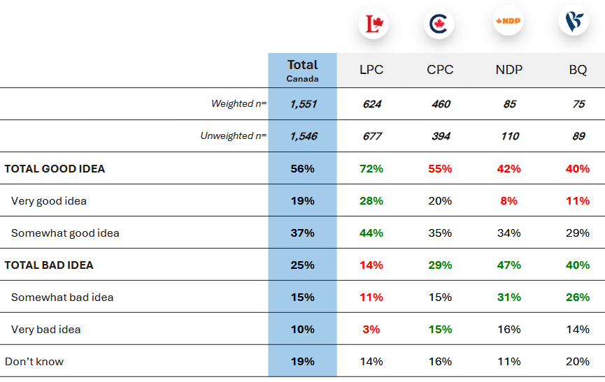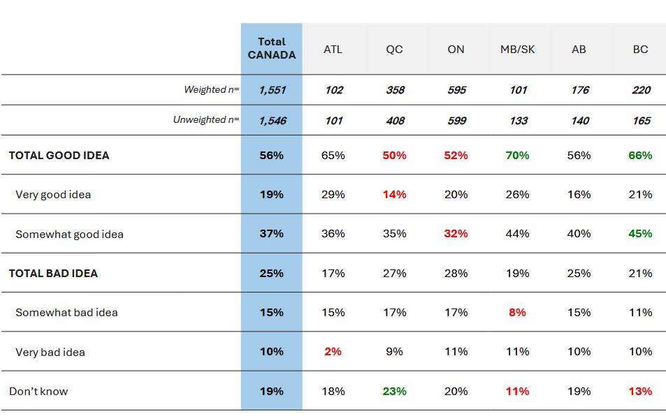 À l’échelle nationale, une nette majorité (56 %) considère que le projet de loi C-5 est une bonne idée, contre seulement 25 % qui pensent le contraire. Le soutien est élevé dans toutes les régions, et même chez les électeurs conservateurs : 55 % d’entre eux appuient le projet de loi.