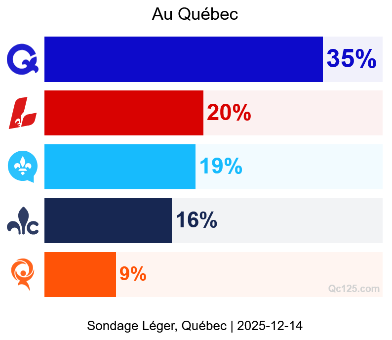 Au niveau national, le Parti québécois récolte 35% d’appui parmi les électeurs décidés et enclins. Il s’agit d’un recul de quatre points par rapport au sondage Léger de la fin novembre — possiblement une simple régression vers la moyenne après ce 39% qui sortait de la fourchette des derniers mois.
