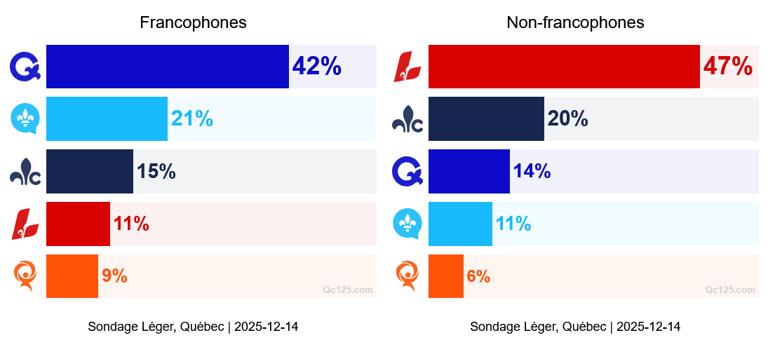 Nous devrons également observer la progression du Parti conservateur du Québec à l’échelle nationale. Avec 15% chez les francophones, le PCQ pourrait causer des surprises s’il se maintient à ce niveau.