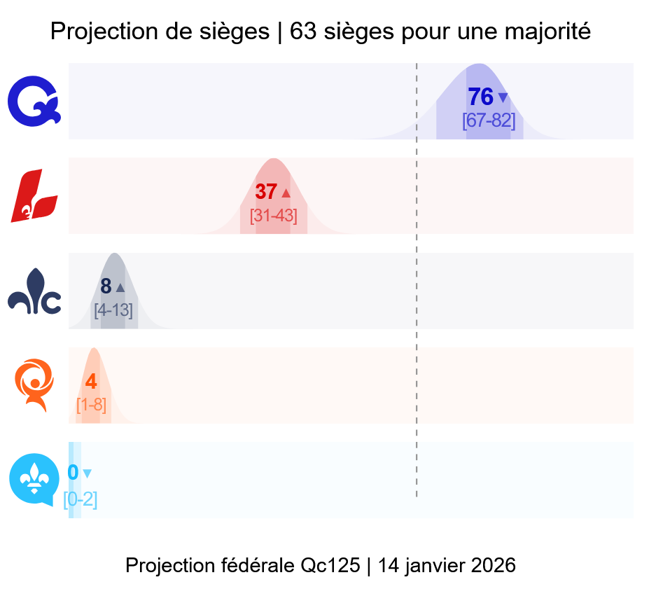 Le Parti libéral du Québec occuperait le poste d’Opposition officielle avec 37 sièges en moyenne, et un intervalle de confiance s’étendant de 31 à 43 sièges.