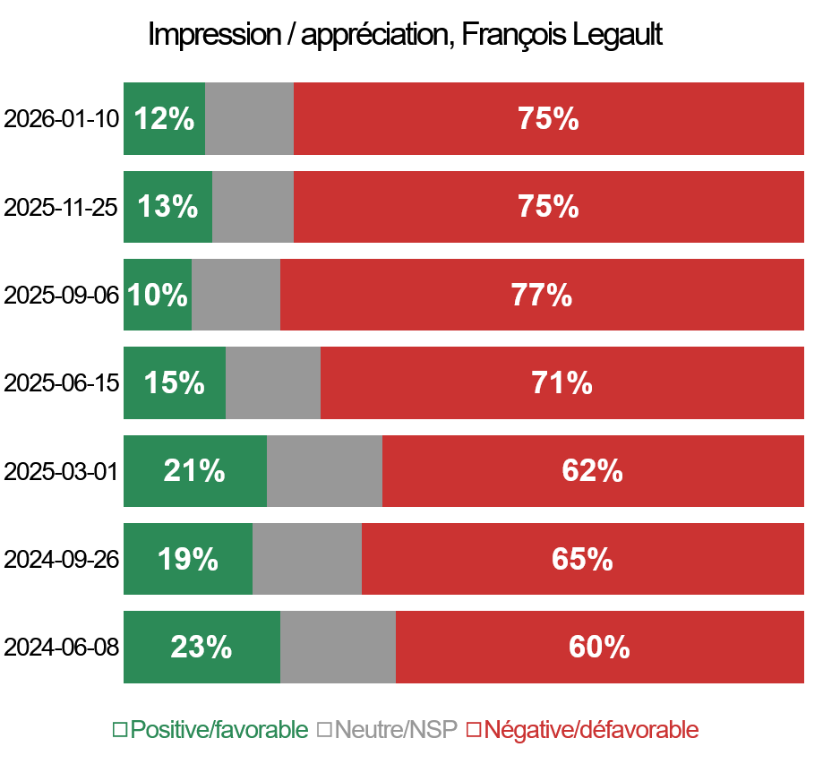 Quant aux taux d’appréciation des chefs de parti, même si aucun d’entre eux n’affiche un taux net positif, le premier ministre se retrouve à nouveau dernier de classe : 12 % d’impressions favorables, 75 % défavorables, pour un différentiel catastrophique de –63.