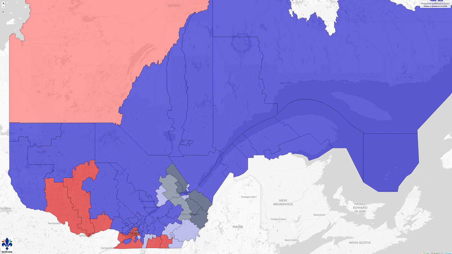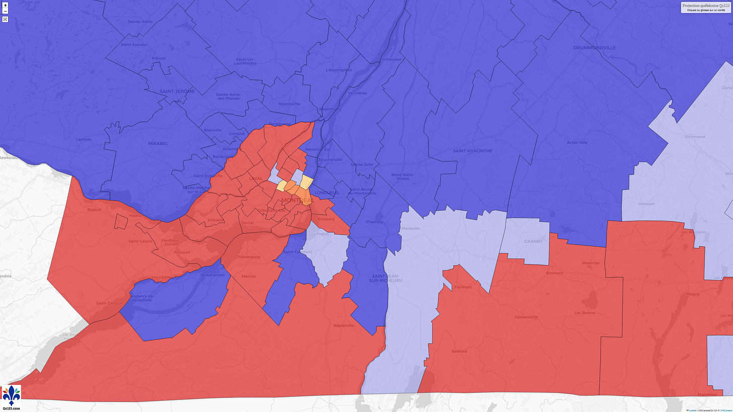 Le Parti libéral du Québec ne progresse pas dans cette mise à jour, mais consolide sa deuxième place avec une moyenne de 38 sièges. Léger lui attribue la tête dans le Grand Montréal, ce qui suggère une remontée dans Laval et l’ouest de la Montérégie. L’Outaouais et l’Estrie commencent aussi à prendre une teinte plus rouge sur la carte.