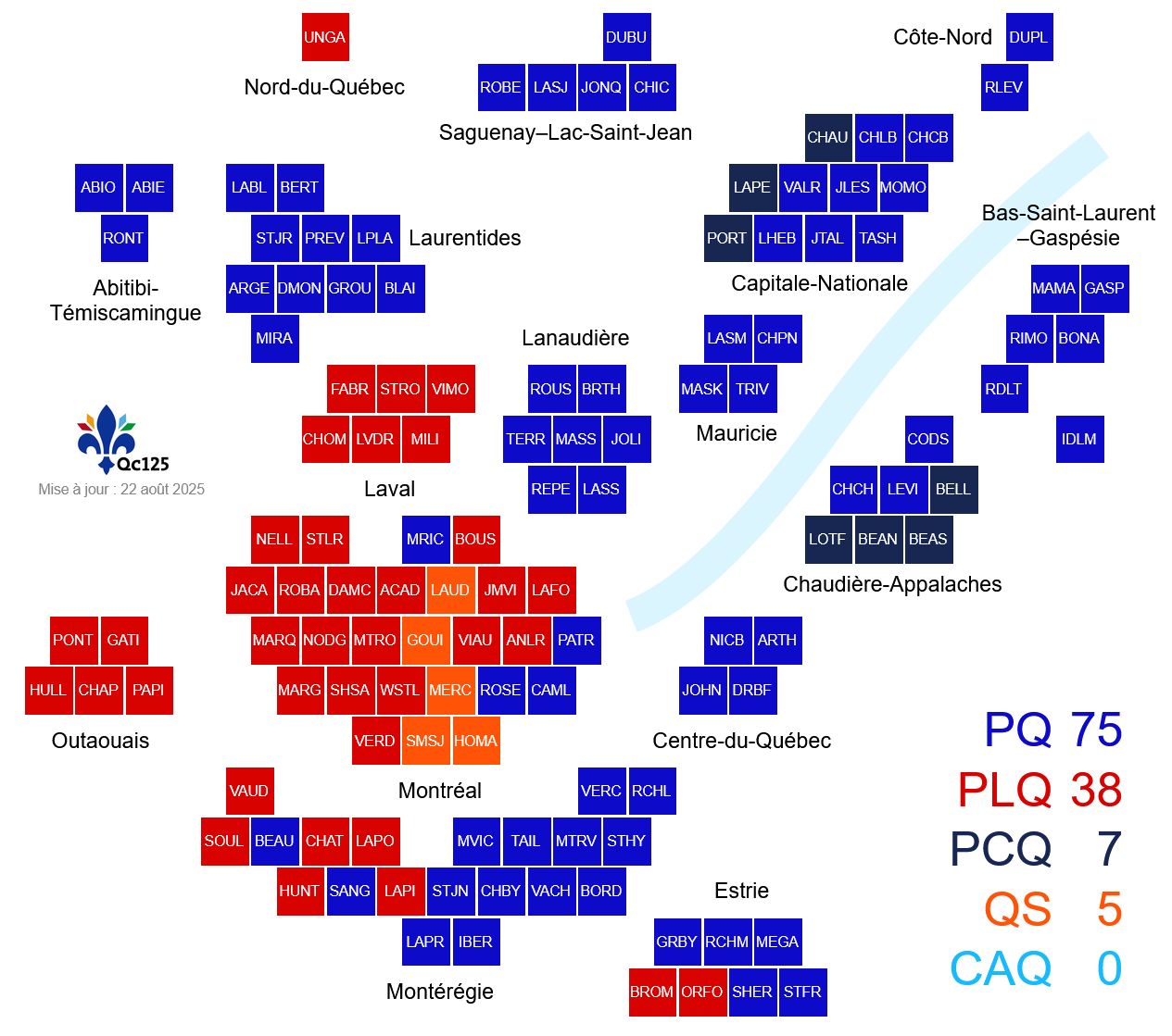 Nous vous présentons aujourd’hui une mise à jour de la projection Qc125 — une photo style « Polaroid » du portrait politique actuel au Québec.