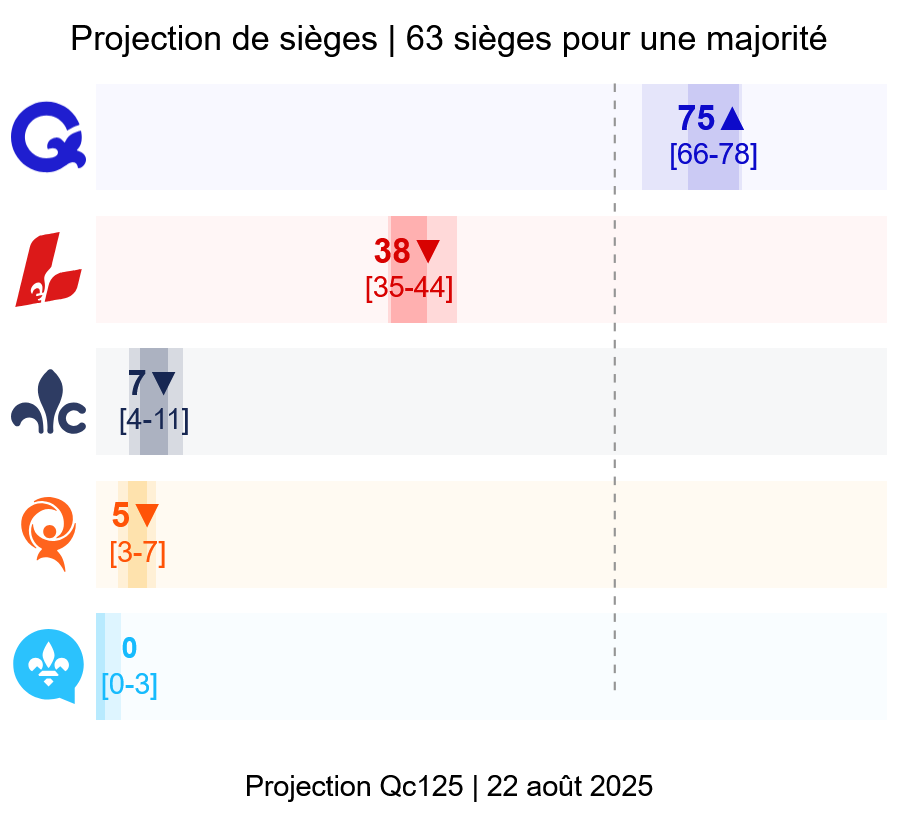 En intégrant le nouveau sondage Léger, la projection Qc125 place le Parti québécois à 75 sièges en moyenne, soit douze de plus que le seuil de la majorité (63).