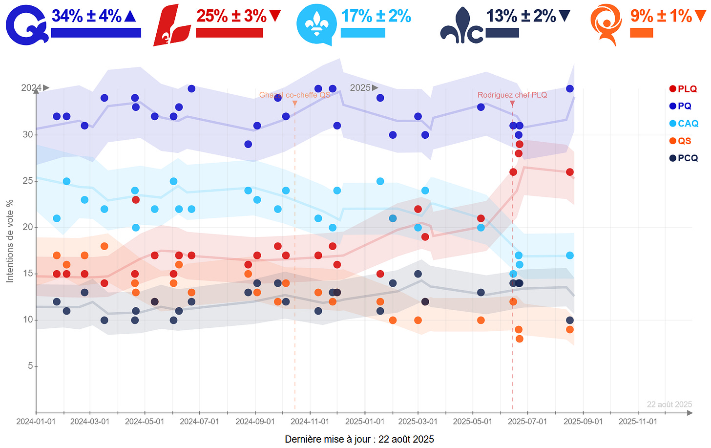 Le plus récent sondage de la maison Léger, publié mercredi dans les médias de Québecor, accorde 35 % d’appuis au Parti québécois à l’échelle nationale (+5 points depuis juin), dont 45 % auprès de l’électorat francophone (+7). Ces résultats, combinés à la division actuelle du vote, placeraient le PQ confortablement en territoire majoritaire si des élections avaient lieu ce mois-ci.